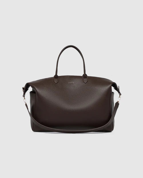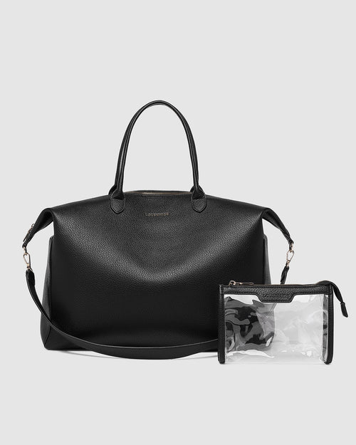 The Louenhide Ohio Frappe Overnight Bag is the ideal travel carryall for holidays or business trips. Designed with a compact, rectangular silhouette, this sleek women's overnight bag is perfectly sized to fit in overhead luggage compartments. Featuring luxe, smooth vegan leather, a spacious interior with a secure zip closure, and two external slip pockets on each end, this women's travel bag is both stylish and functional. The Ohio Frappe also comes with a clear plastic pouch to secure your cosmetics and prevent leaks. With three ways to wear, carry this classic unisex overnight bag by the long top handles, over the shoulder with the detachable crossbody strap, or hands free with the hidden trolley sleeve effortlessly slipped over your suitcase handle.