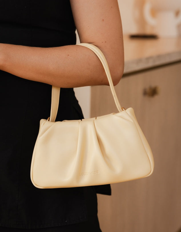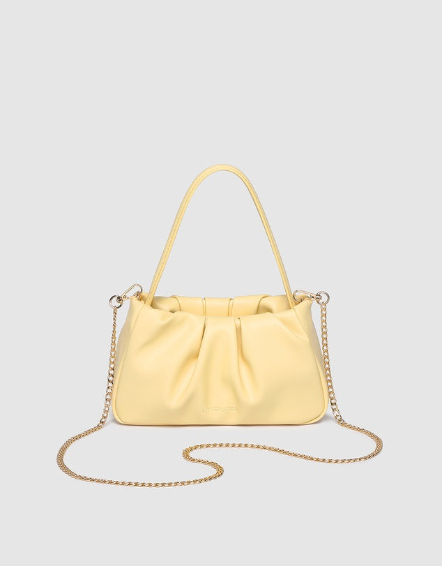 The Louenhide Uma Butter Yellow Handbag is your go-to plus-one for everything from elegant events to leisurely long lunches. Crafted from smooth vegan leather with a softly ruched silhouette, this versatile mini top handle bag moves effortlessly from day to night. Balancing timeless style with practical design, Uma Butter Yellow offers three ways to wear: as a small crossbody with chain for a touch of glamour, with the sleek leather shoulder strap for a refined finish, or without straps for a polished clutch moment. A discreet magnetic button closure keeps essentials secure, while its compact size ensures Uma Butter Yellow makes a statement wherever you take her.