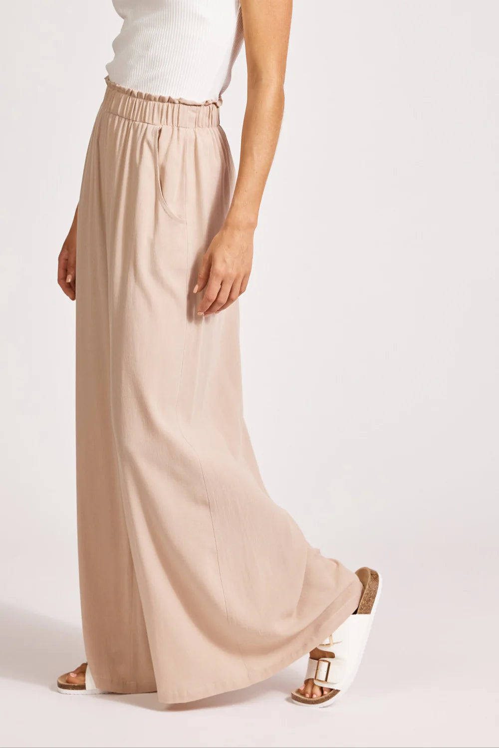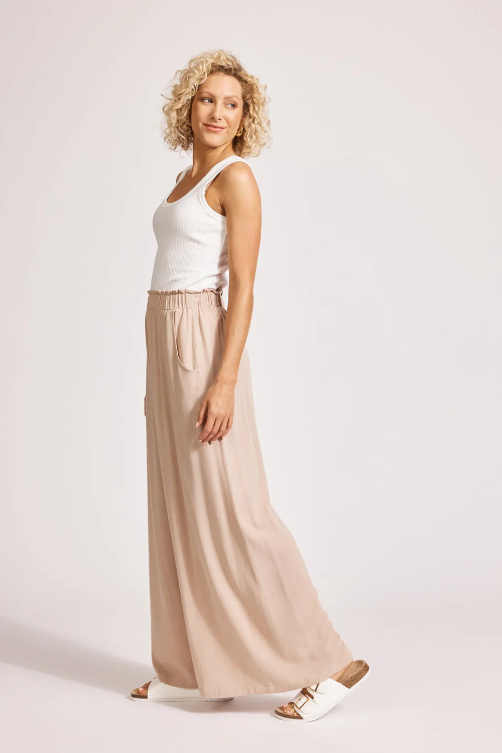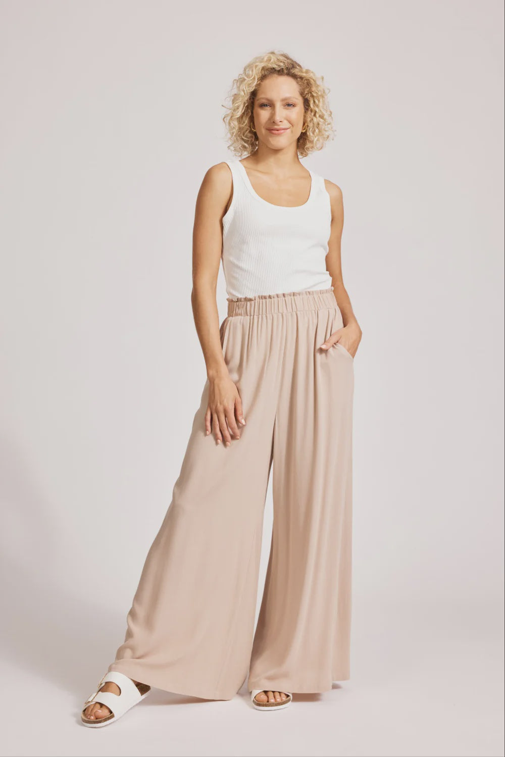 A flowing palazzo pant for elevated ease. Crafted from soft, draped fabric. Features a pull-on elasticated waistband, functional pockets, and wide full-length leg.