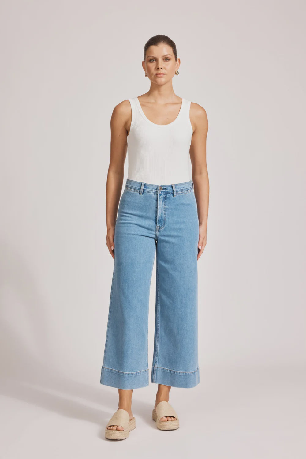 A slim A-line denim style for everyday wear. Crafted from cotton-rich stretch denim. Features a 7/8 length, fixed waist with belt loops, and wide cuff detail at the hem. Complete with contrast stitching and functional back pockets.