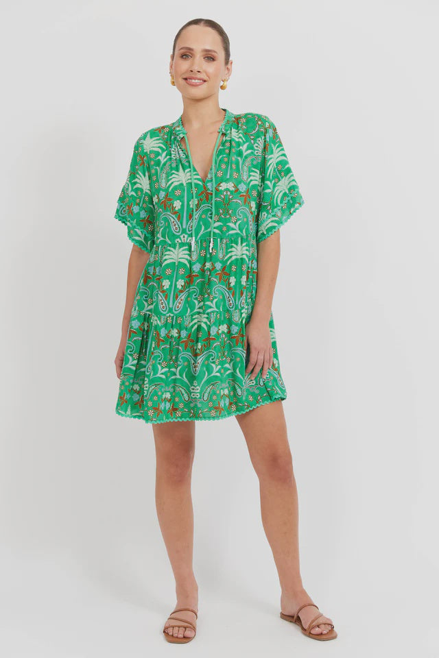 Slip into the Haiti Dress and instantly feel sun-kissed. This breezy beauty features a soft V-neckline with cotton ties, ric-rac trim, and a relaxed tiered silhouette. The short double-layer sleeves and airy linen blend add to its effortless charm, while internal side pockets keep it practical for days on the move.