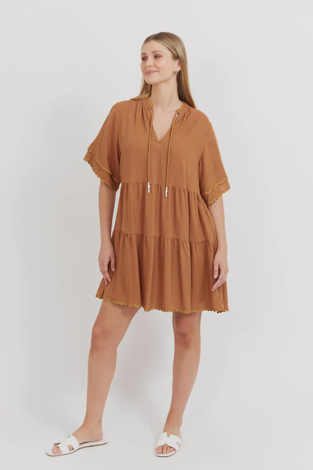 Slip into the Haiti Dress and instantly feel sun-kissed. This breezy beauty features a soft V-neckline with cotton ties, ric-rac trim, and a relaxed tiered silhouette. The short double-layer sleeves and airy linen blend add to its effortless charm, while internal side pockets keep it practical for days on the move.