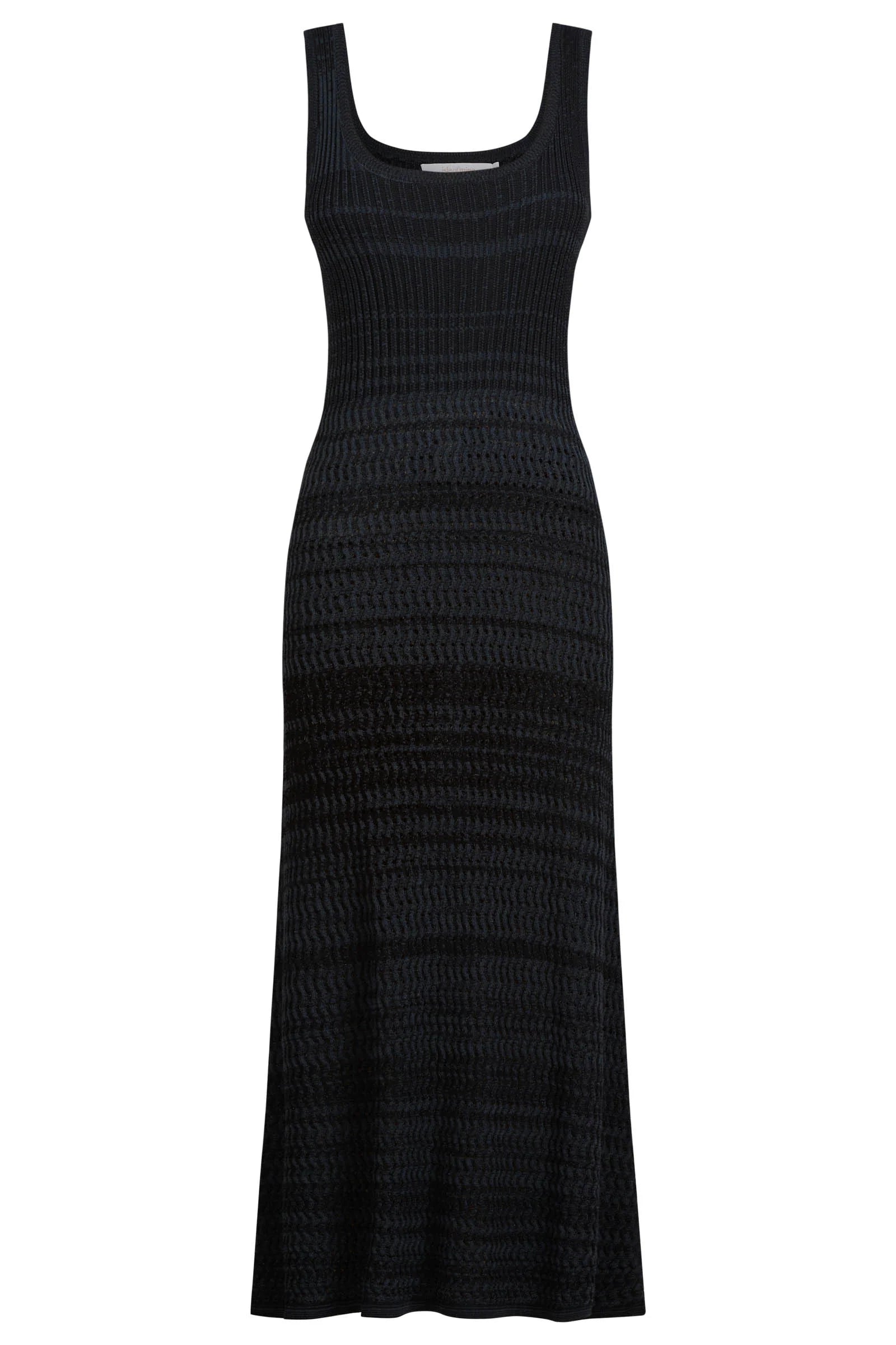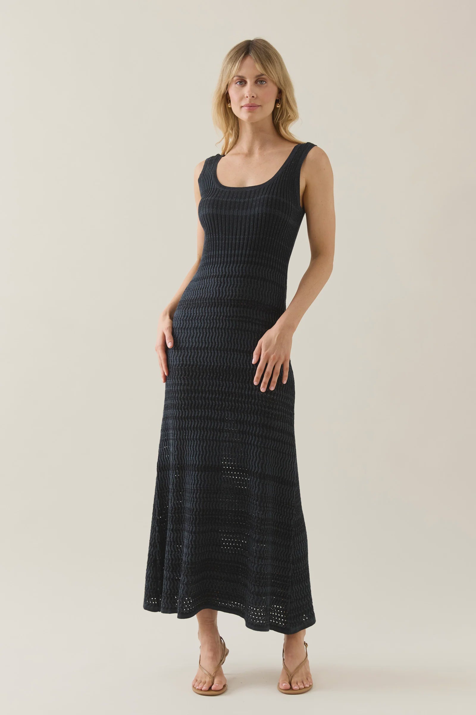 A textural pointelle-knit dress crafted from 100% cotton. This 7/8-length dress features mixed two-tone woven fibres for visual depth, a rounded neckline, and a softly flared mermaid-style hem. This dress offers subtle glimpses of skin.