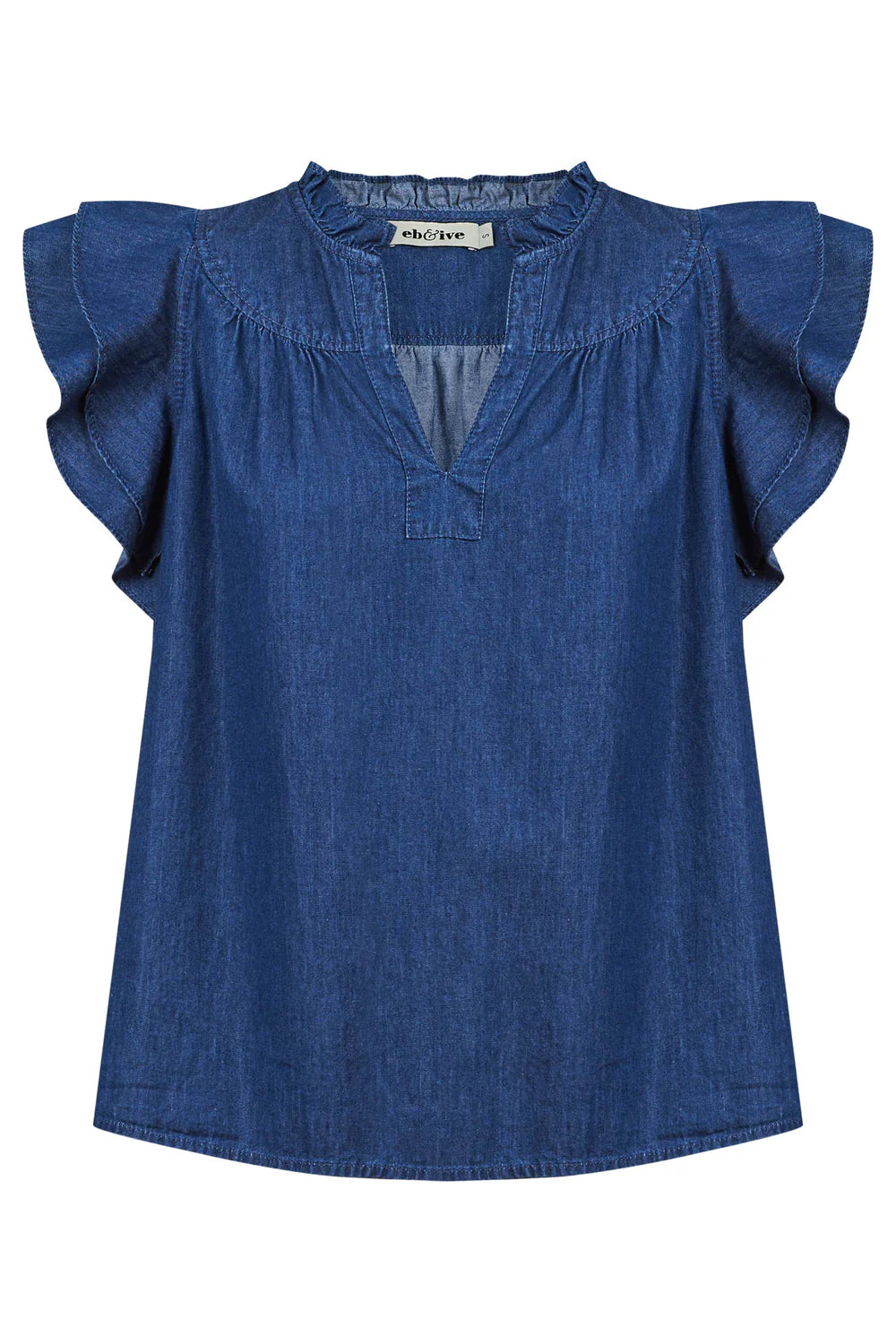 A beautifully soft and lightweight chambray frill top. Crafted from 100% cotton to have an effortless denim look. Features V neckline with slight frill collar, double-layered cap sleeve with frill detail, and seam detailing at yoke on front and back.