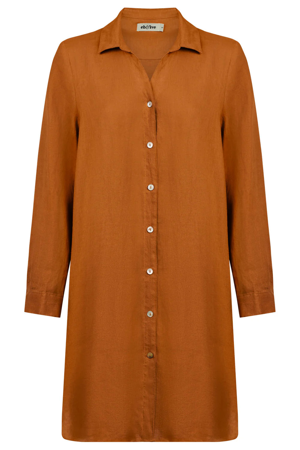 A relaxed staple shirt dress, perfect for warm weather holidays. Crafted from 100% Linen for breathable ease. Features a classic collar, shell button-through front, long sleeves, curved hemline, and functional pockets.