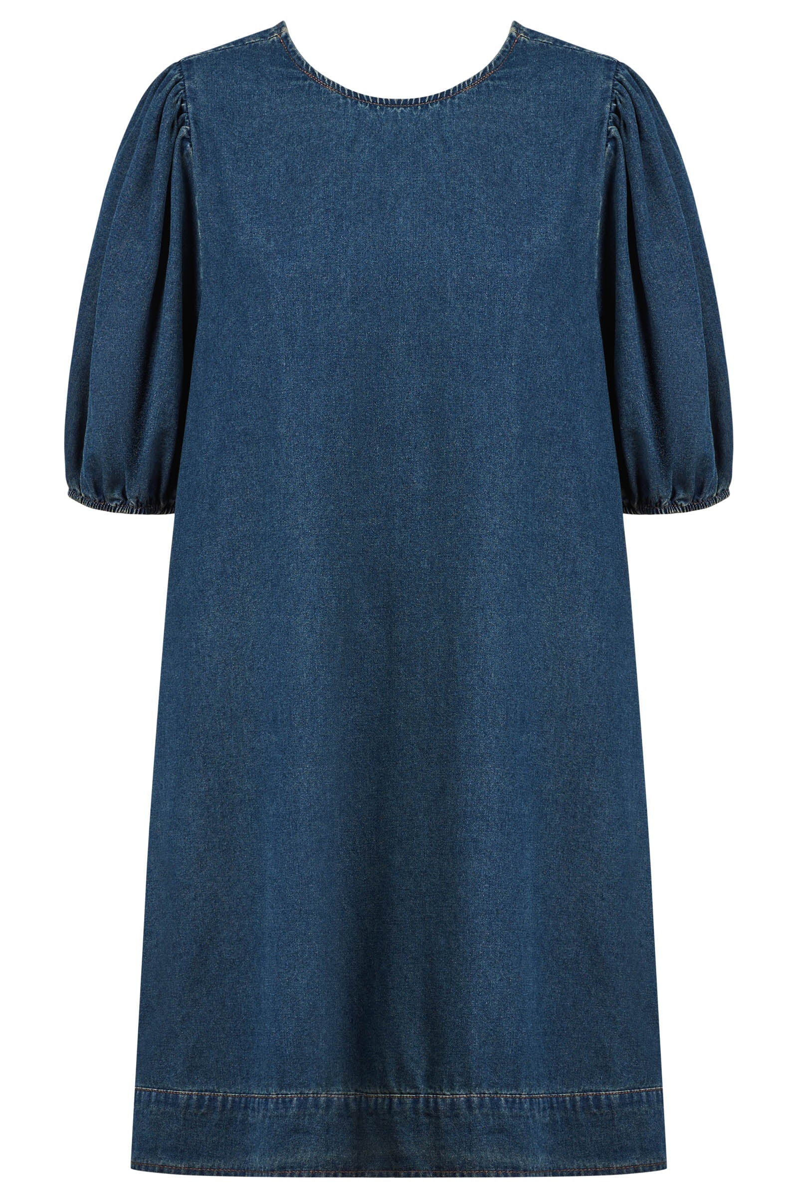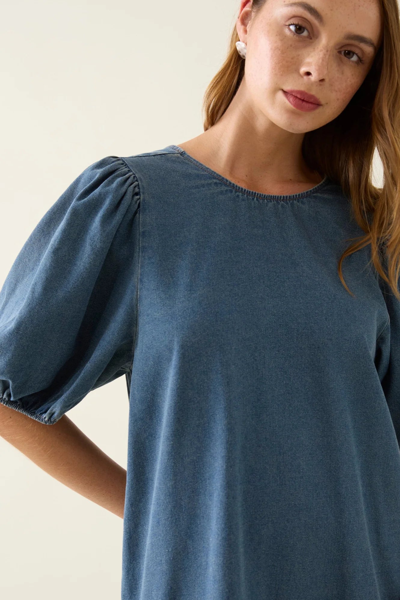 A refined staple that combines comfort with structured style. Made from lightweight denim, this dress features a round neckline, puff sleeves and side seam pockets. A scooped back and topstitched wide hem complete the silhouette.