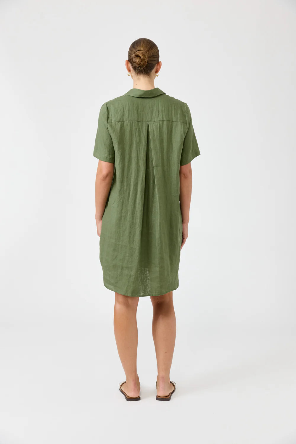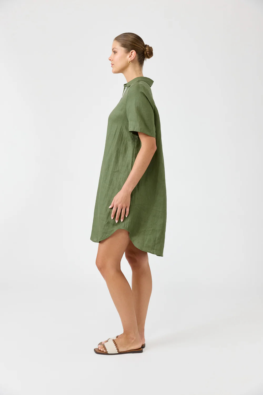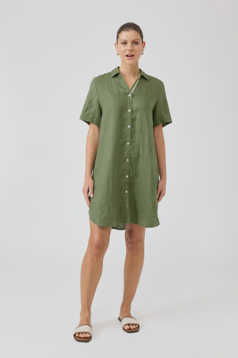 A versatile wardrobe staple designed for effortless, everyday style. Crafted from premium 100% linen for breathable comfort. Features a collared neckline, button-through front, and chic contrast trim at the inner collar. Short sleeves, a back pleat, and a curved high-low hem create a flattering, easy silhouette. Designed to fall to the knee with a regular fit.