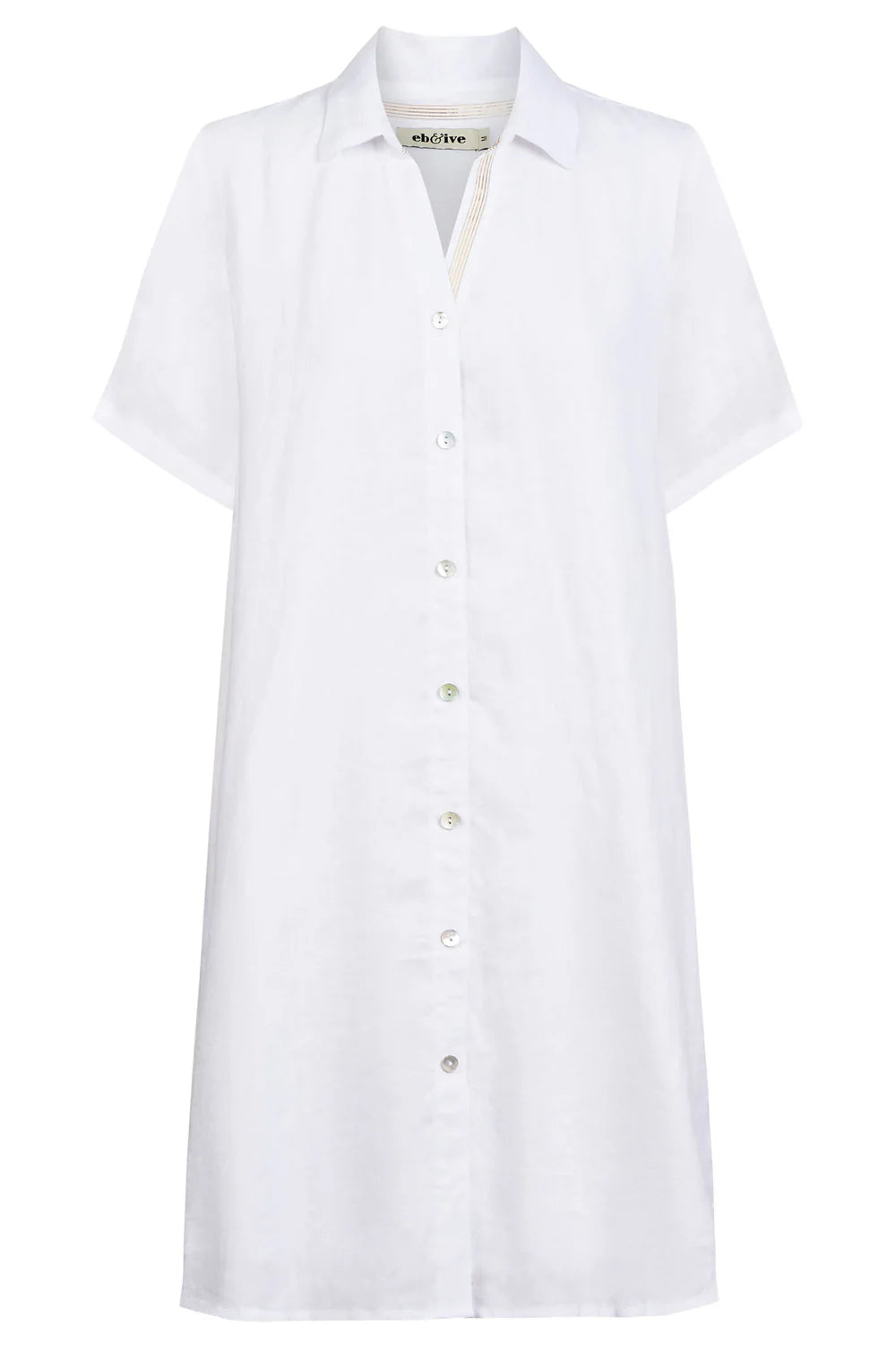 A versatile wardrobe staple designed for effortless, everyday style. Crafted from premium 100% linen for breathable comfort. Features a collared neckline, button-through front, and chic contrast trim at the inner collar. Short sleeves, a back pleat, and a curved high-low hem create a flattering, easy silhouette. Designed to fall to the knee with a regular fit.