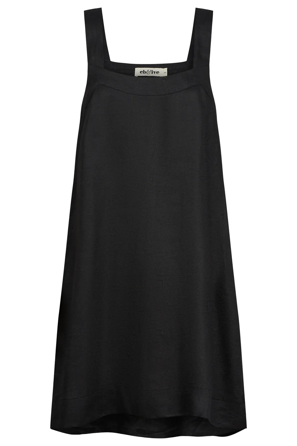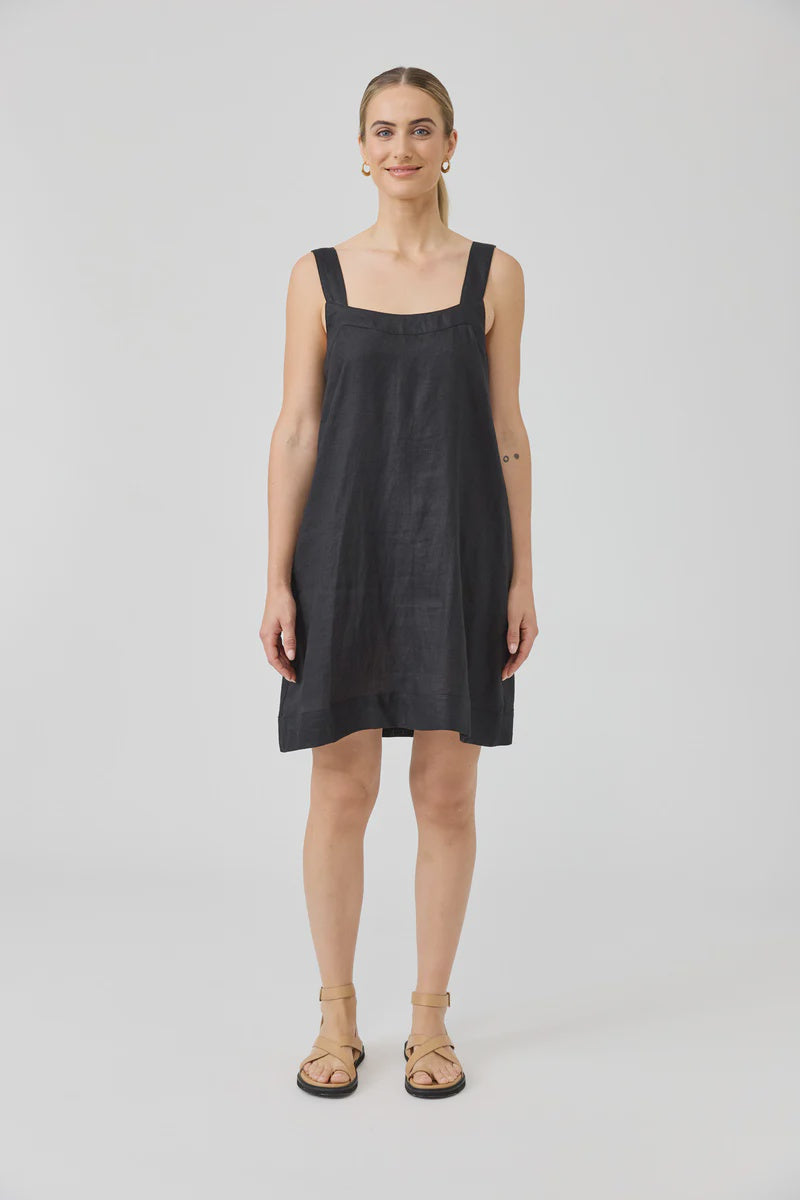 Crafted from 100% linen for breathable, lightweight comfort. Designed with a square neckline, wide shoulder straps, and a relaxed silhouette that falls to the knee. Features functional side pockets and is fully lined in white for ease of wear. True to size fit for an effortless feel.