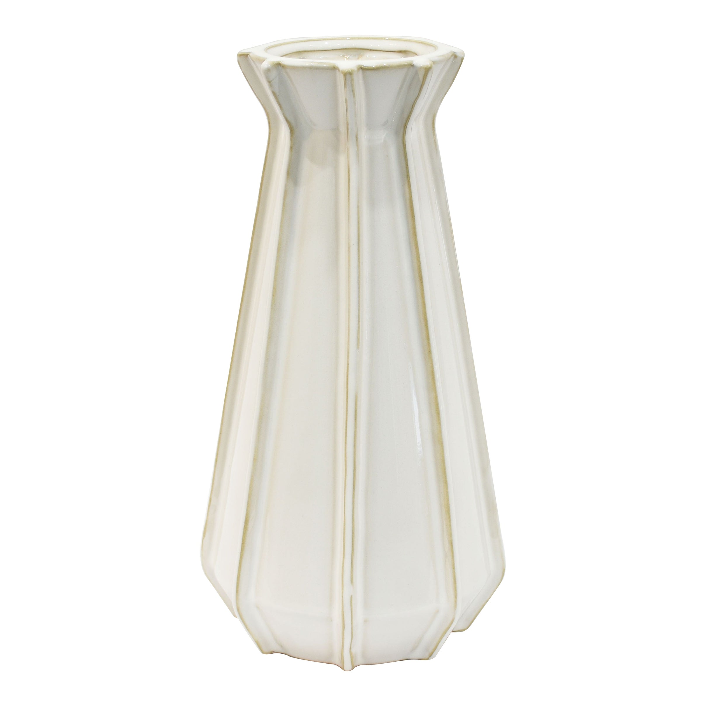 This Hester Ceramic Vase is crafted from ceramic in a tapered ridged shape, with a white finish displaying antique-look detailing.