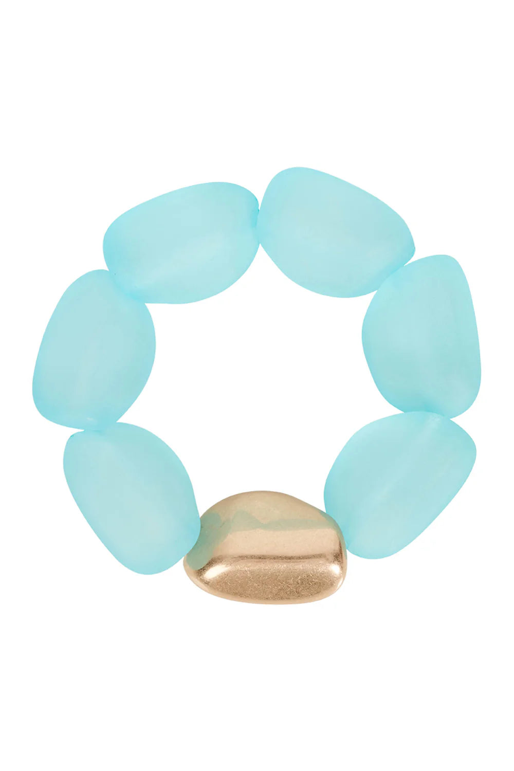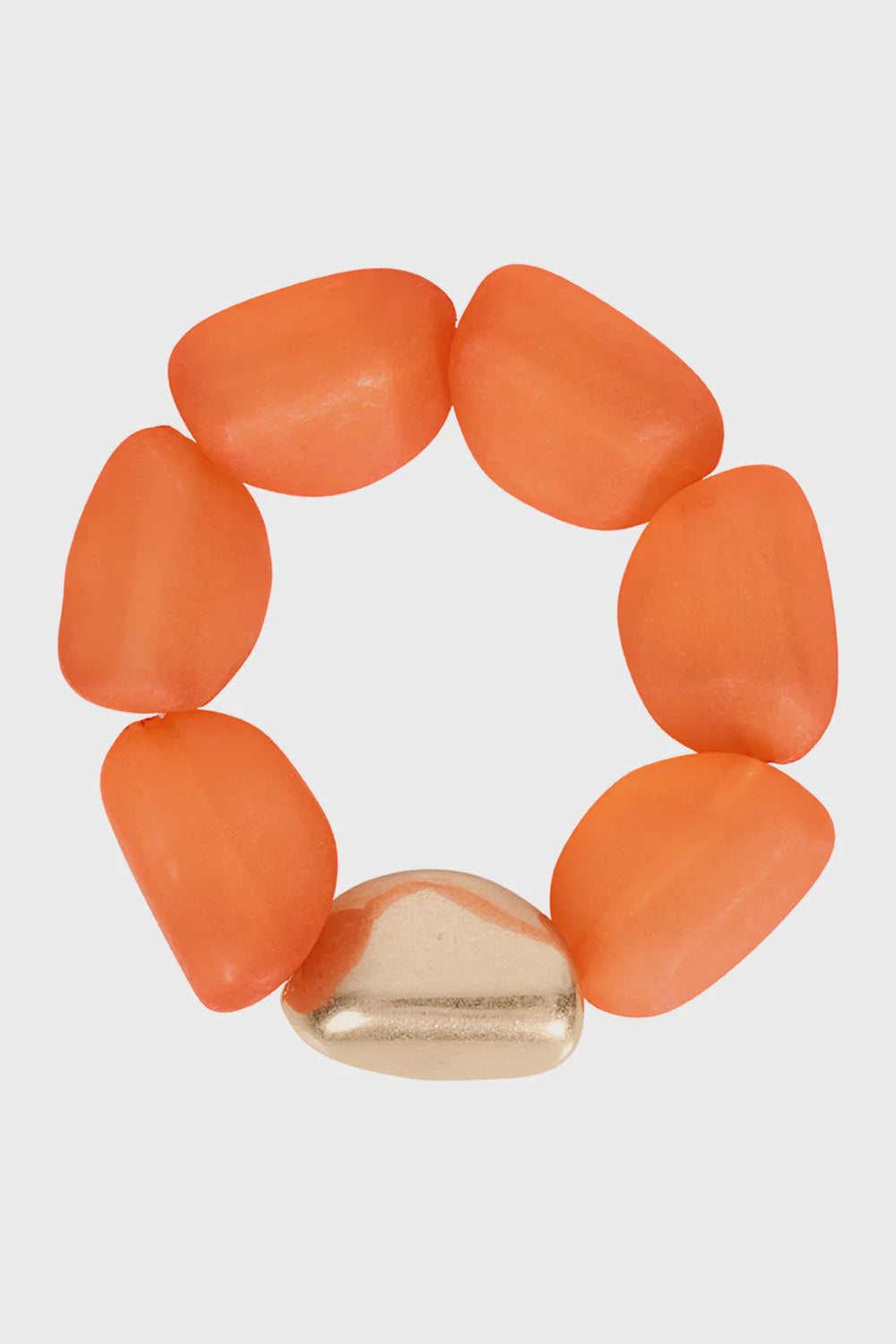 An elasticated bracelet made from frosted resin beads. Sculptural and understated.