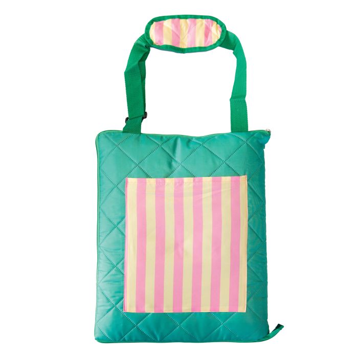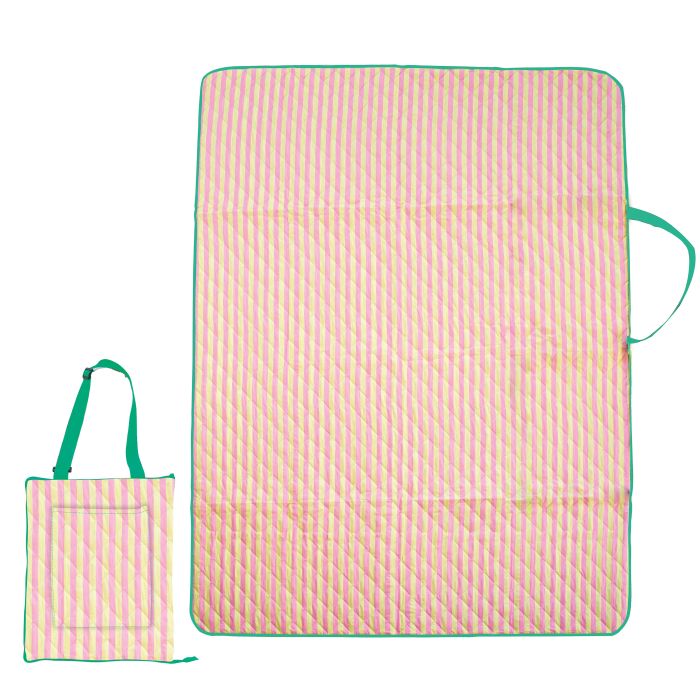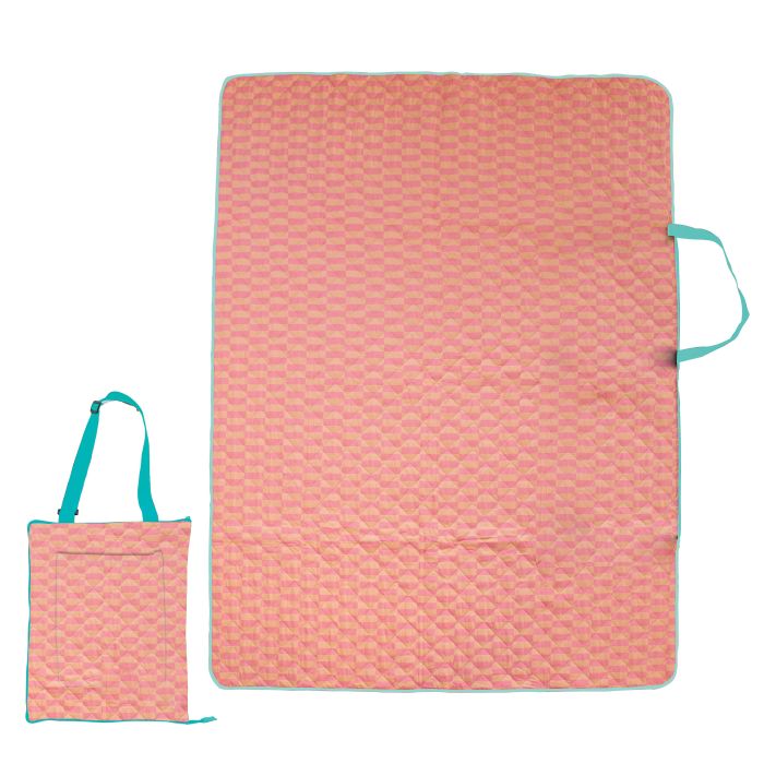 1.5 x 2m quilted picnic rug , which folds into a bag with handy carry strap.