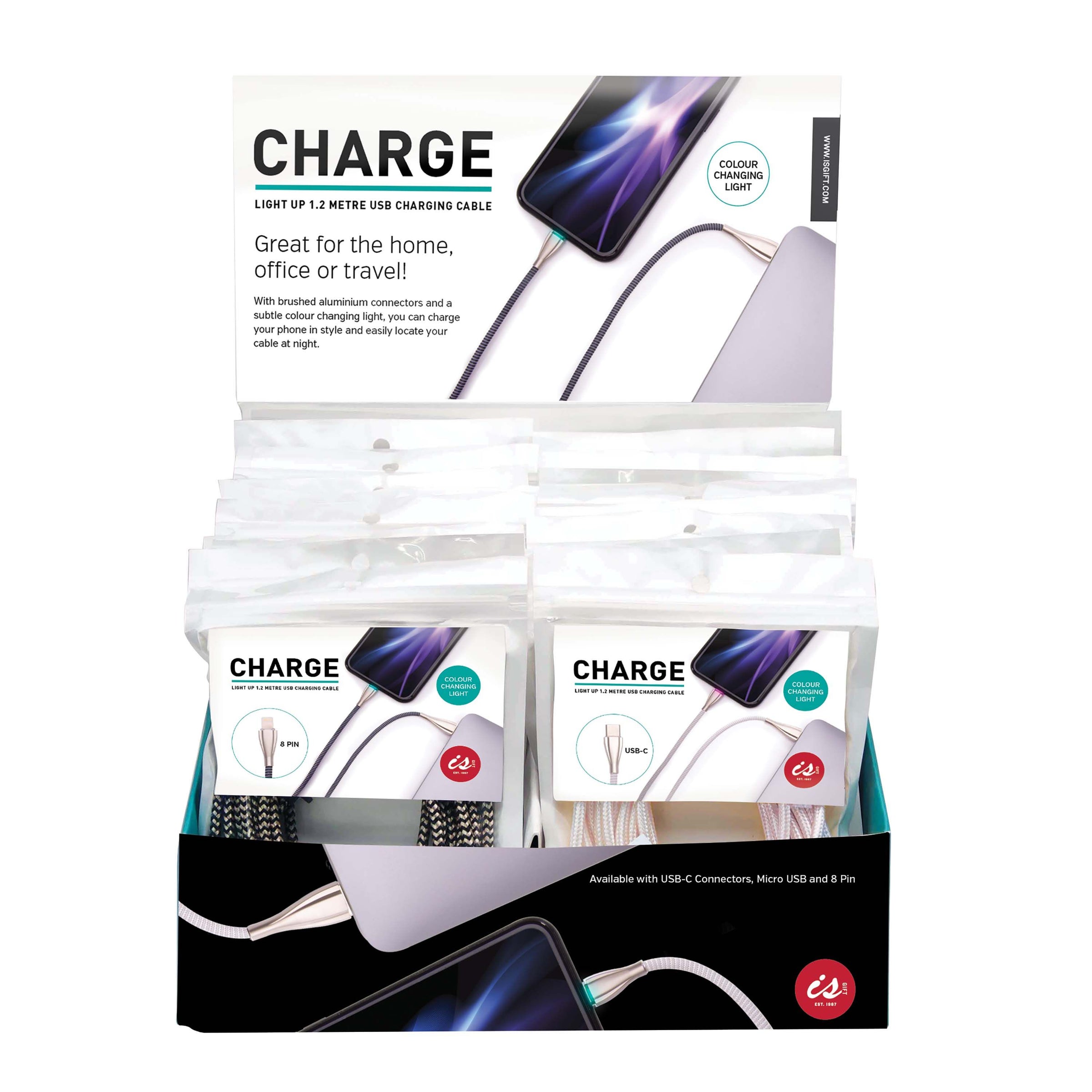 High quality 1.2mtr cable with light up/ colour changing end, so you can easily plug in your phone at night