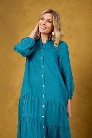 Look good and feel great in the Diaz Shirt Dress, made with luxurious linen fabric. The collar detail, gathered tiers, and button-down design adds sophistication. Make a chic entrance to a winter cocktail party or a festive holiday dinner with this elegant maxi dress. Simply layer a scarf or cardigan when the temperature starts to drop.