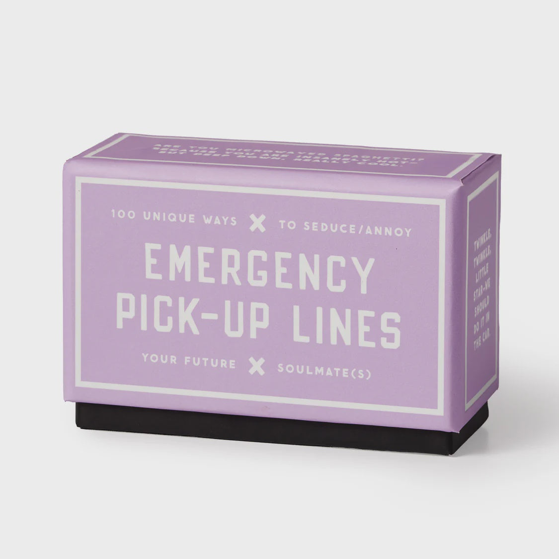 EMERGENCY PICK-UP LINES – When words fail you (or you're just too flustered to be charming), this set of 100 double-sided cards comes to the rescue. Packed with flirty one-liners, awkward icebreakers, and hilariously questionable compliments, each card is your ticket to starting a conversation—or at least making someone laugh. Bonus: the back of each card has space for notes, doodles, or tracking your batting average. Because hey, flirting is a numbers game.