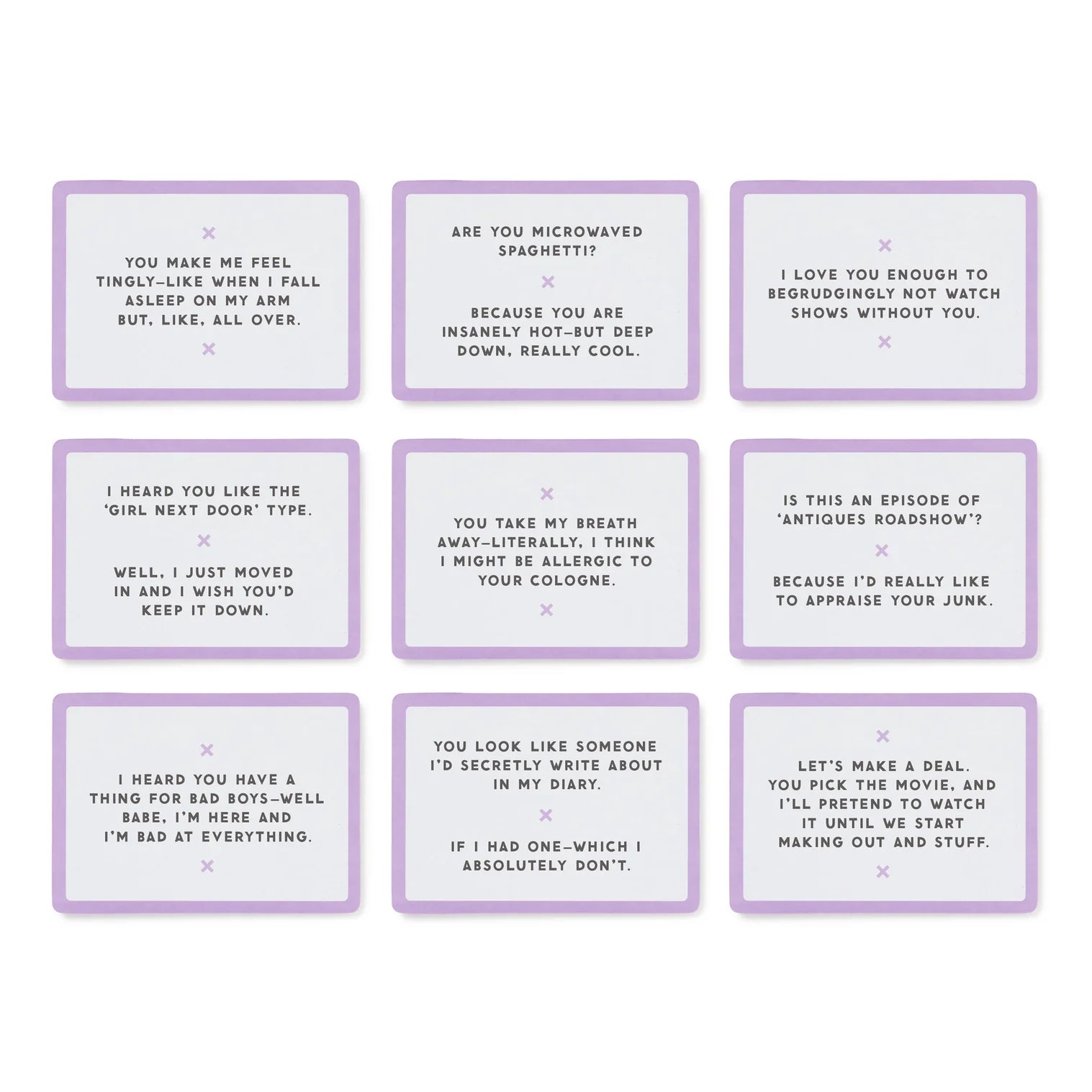 FOR THOSE “OH NO, I NEED A LINE” MOMENTS – Whether you're out on the town, stuck in a meet-cute at the bookstore, or trying to text without sounding like a robot, this deck is your new secret weapon. Use it to charm strangers, flirt with friends, or just make yourself laugh in the mirror like the dazzling human you are. Keep a few in your pocket—you never know when you'll need to make a memorable first impression.