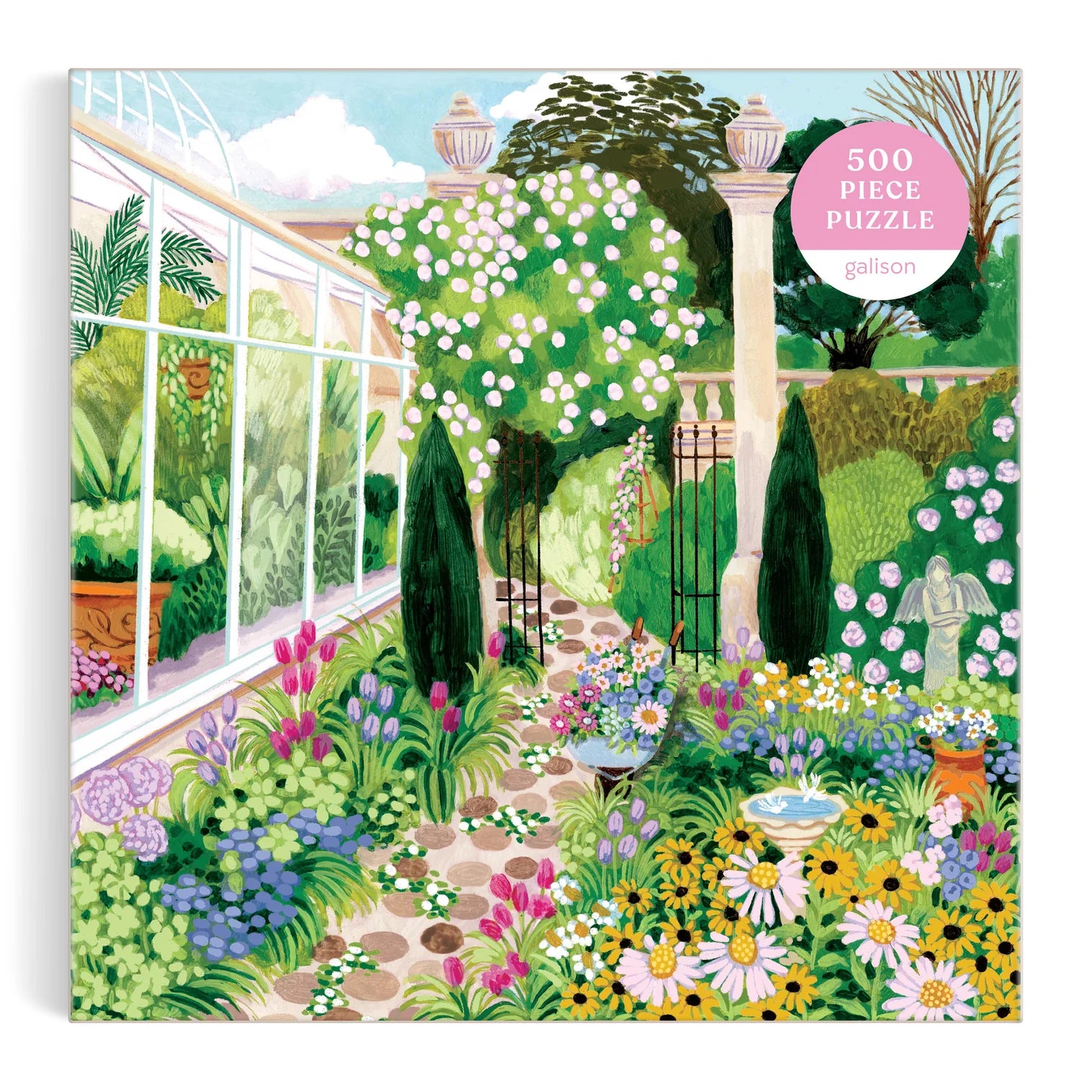 500 PIECE PUZZLE – Step into a tranquil springtime escape with the Evergreen Gardens 500 Piece Puzzle by Galison. This beautiful puzzle captures a dreamy cobblestone path winding alongside a glass conservatory, overflowing with colorful blooms. With every piece placed, you’ll uncover a world of lush greenery, delicate flowers, and sunlit glass panels that reflect the peaceful charm of a garden in full bloom. It's a relaxing, artful activity for nature lovers and puzzle fans alike.