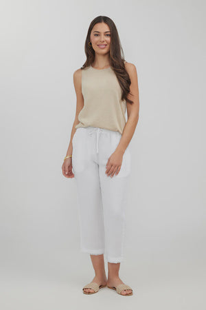 A must-have through the summer months! A sought after, effortless 3/4 pant with a tapered leg that’s crazy comfortable and easy to style back with your favourite basics. Crafted from 100% linen and finished off with a raw edge/fray hem detail.