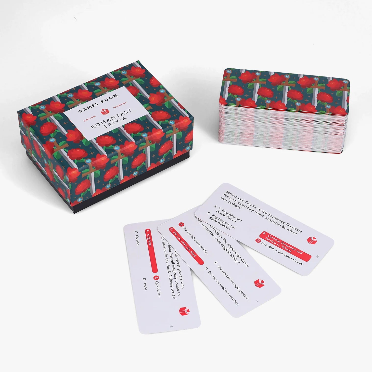FUN FOR ROMANTASY FANS: Challenge your knowledge of the romantasy genre with 140 steamy, spellbinding trivia questions about beloved novels, authors, plots, characters, fandoms, and more! With three optional difficulty levels, this deck is perfect for players with every level of romantasy knowledge.