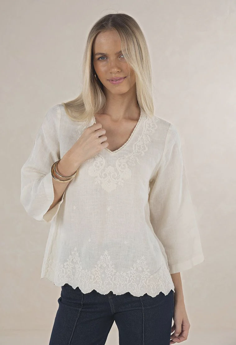A beautifully detailed embroidered blouse, the Serre Top features a flattering v-neckline trimmed with delicate lace and intricate embroidery that adds a subtle artisanal touch. Crafted from soft, garment-dyed 100% linen. Designed with a relaxed fit that gently falls away from the body and finishes just below the hip. This is an easy-wear style that pairs perfectly with our Escapade Jean or Fleetwood Linen Pants.